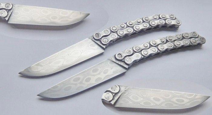 Далее вы сможете увидеть ножи, сделанные из автомобильного поршня, гаечного и газового ключа, мотоциклетной цепи и ещё многого-много других не менее интересных лезвий.
