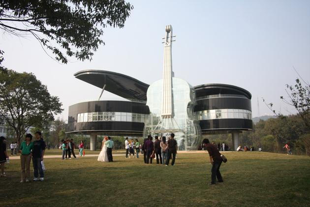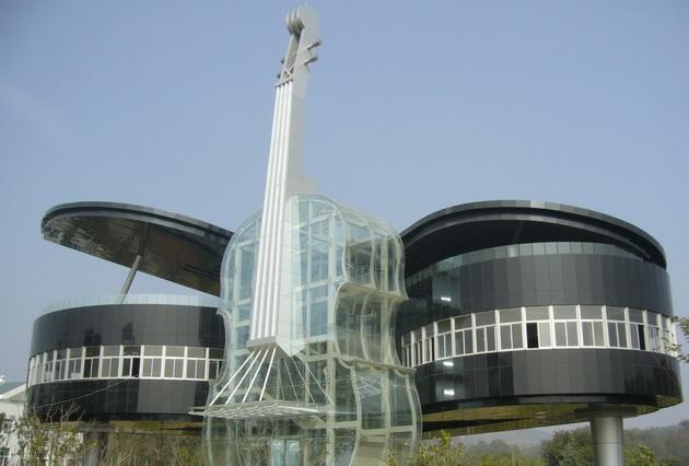 Изучающие архитектурный дизайн студенты Хефейского технологического университета включили свою фантазию, и вместе с профессионалами из дизайнерской компании «Huainan Fangkai Decoration Project Co.» создали это весьма необычное явление в мировой архитектуре – Дом-рояль со скрипкой (Рiano and Violin Shaped Building), быстро завоевавшим свое, особенное место в списке самых необычных зданий мира.