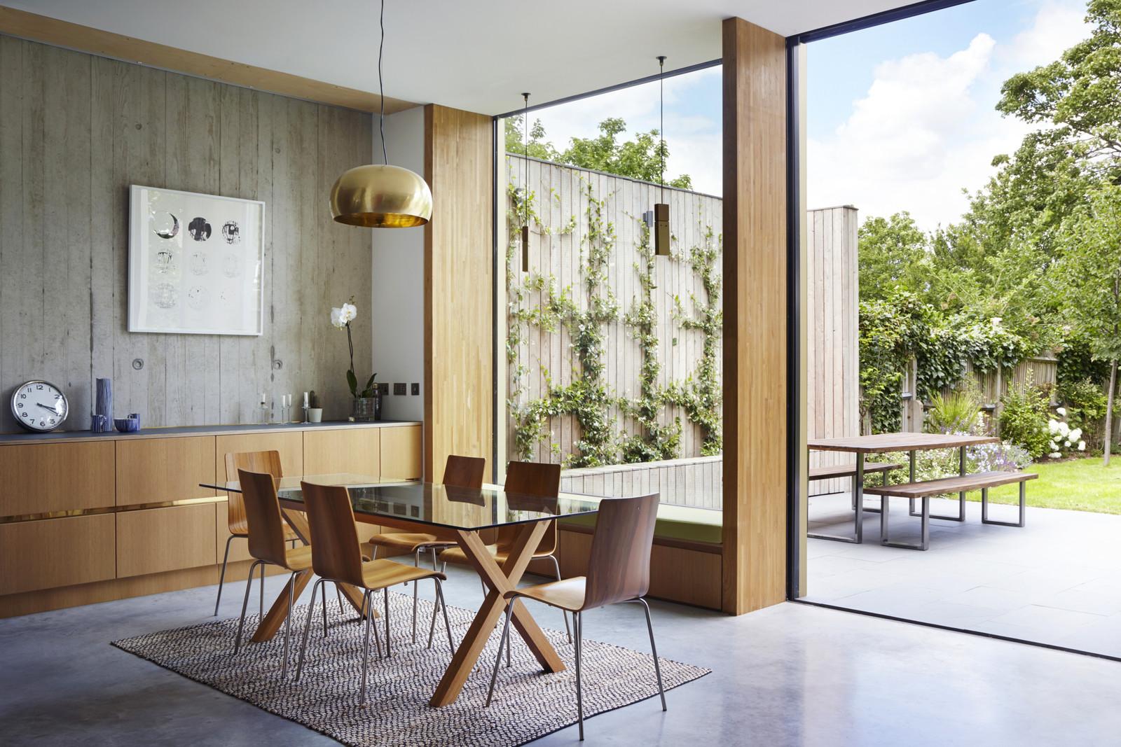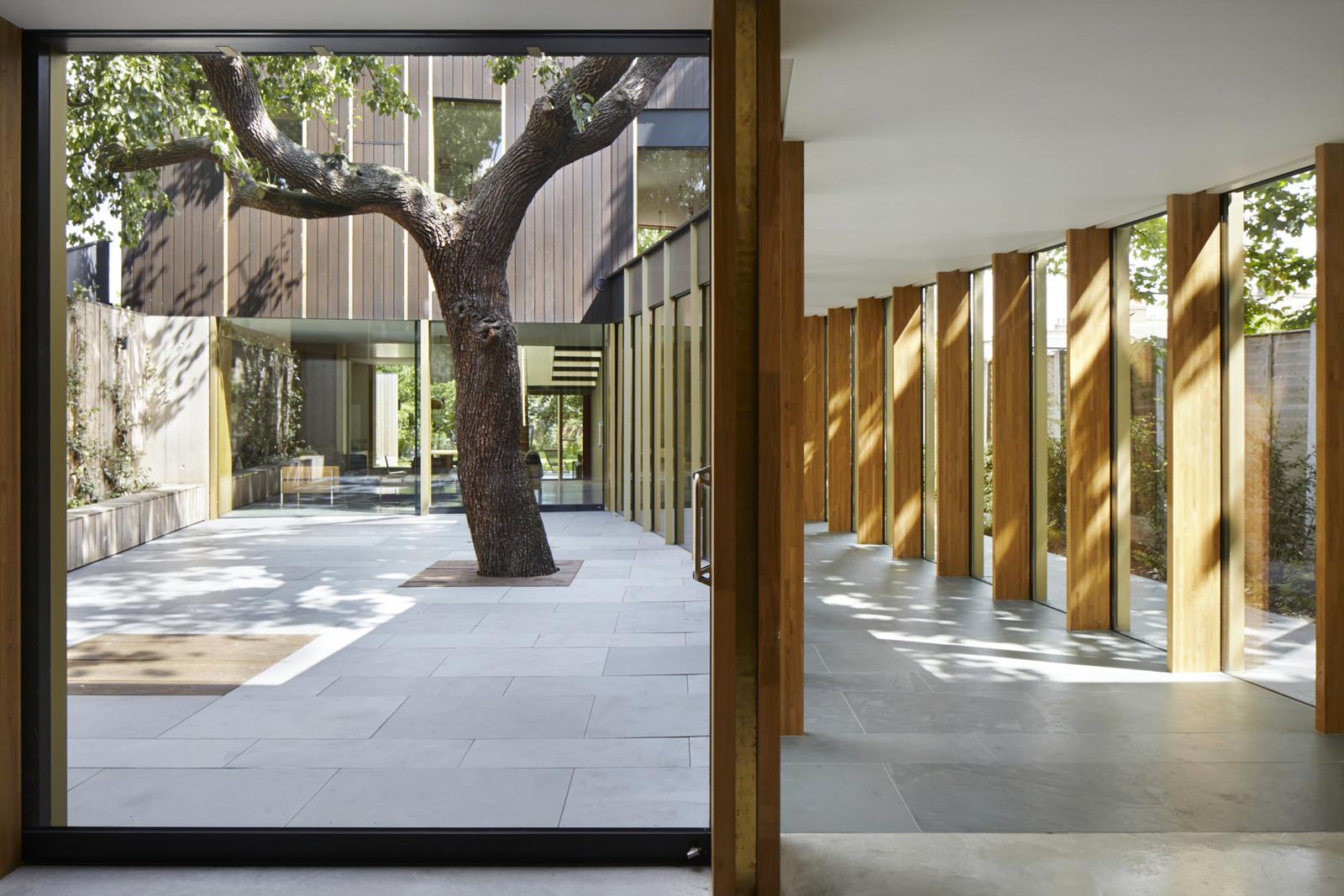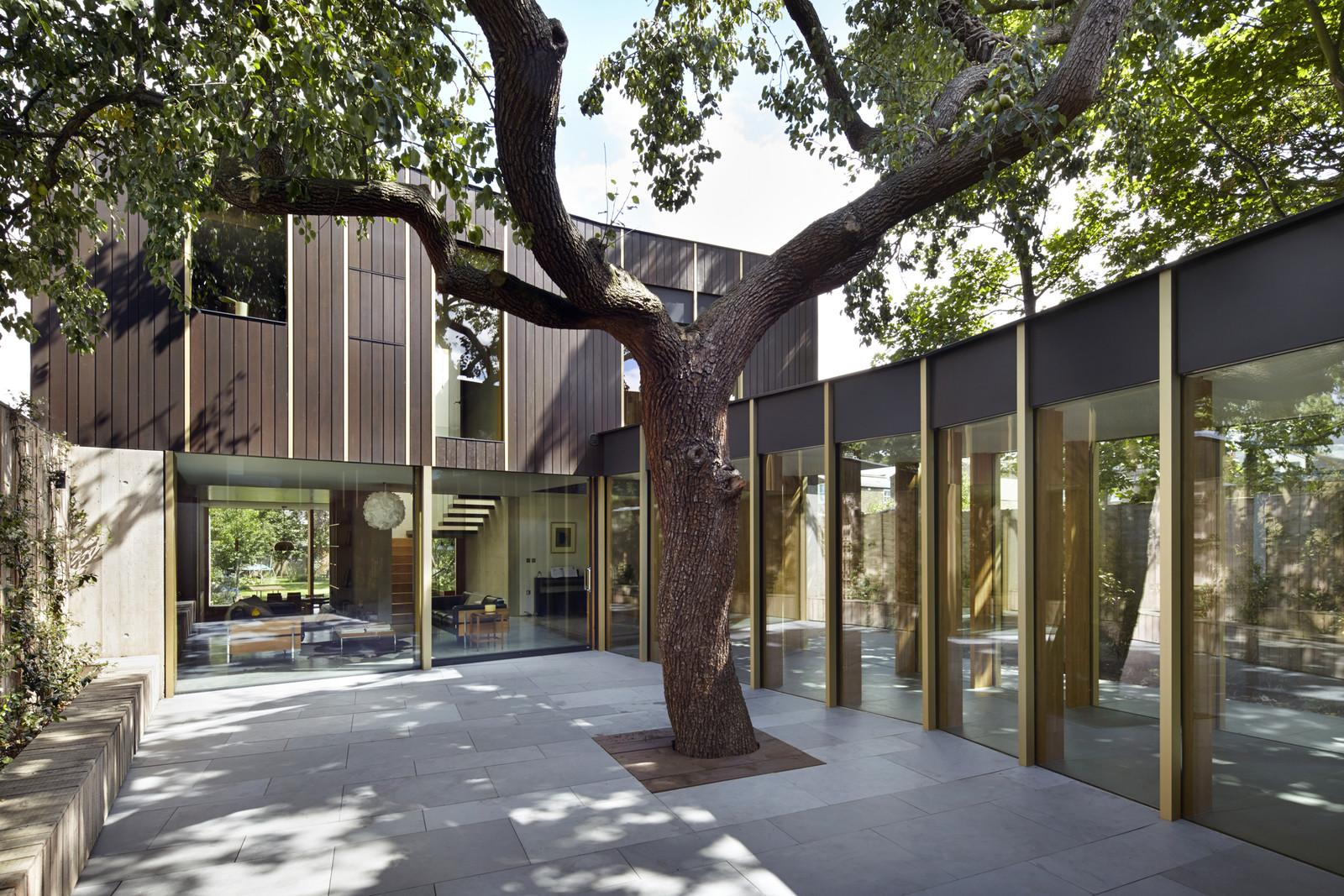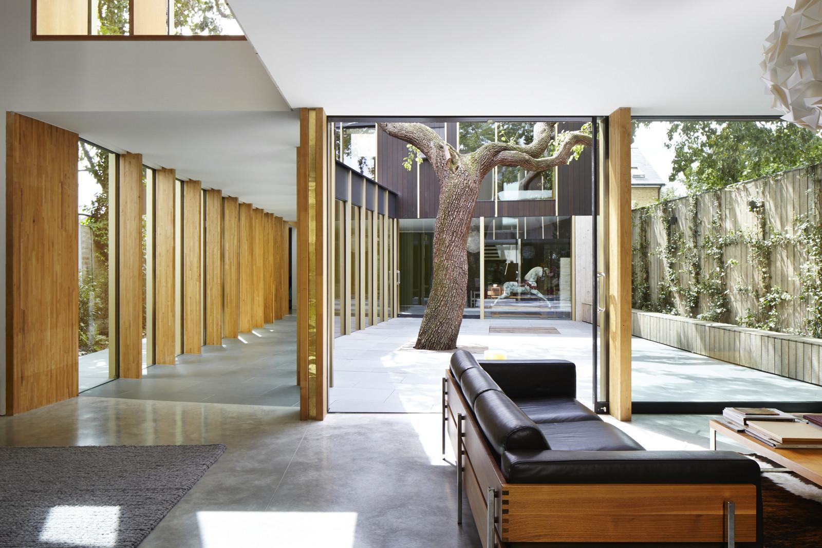 Конструкция состоит из двух блоков, стоящих по обе стороны от внутреннего дворика, центром которого и является достопочтенное дерево. На уровне первого этажа двор отделяет игровую комнату и подсобные помещения от гостиной; а наверху — семейные спальни и ванную от комнаты для гостей и кабинета.