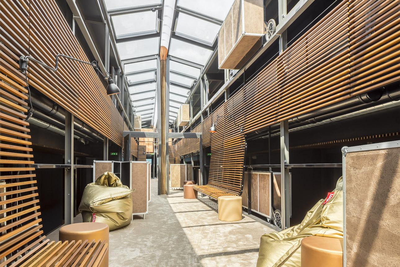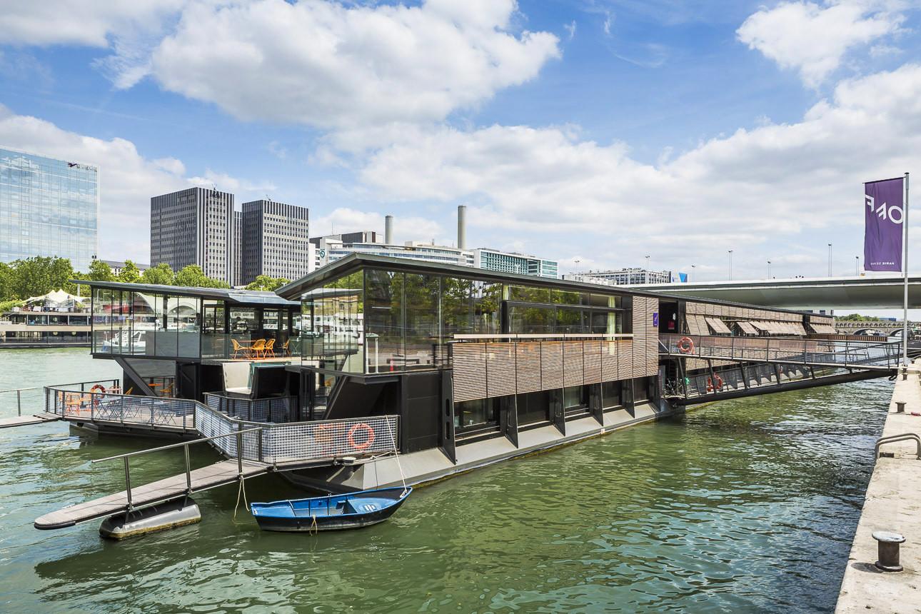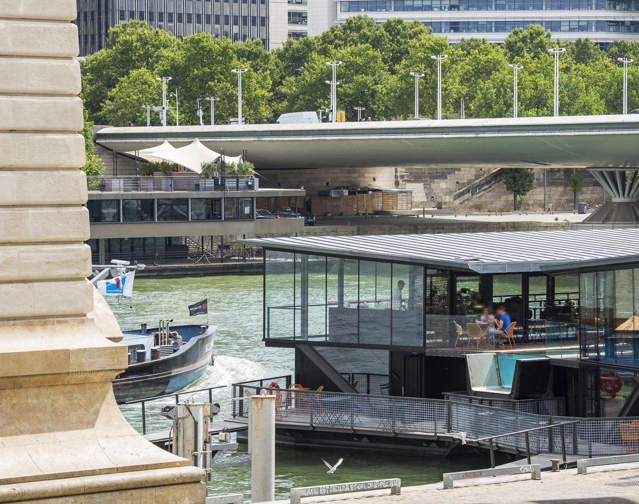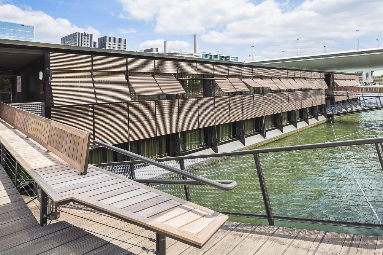 Несмотря на внушительный размер (75 х 18 метров), OFF Paris Seine идеально вписывается в окружающую среду. Его прозрачные стеклянные фасады прикрыты жалюзи, благодаря которым сооружение почти не выделяется на фоне застройки набережной.