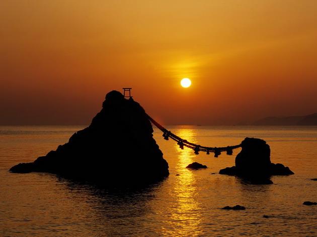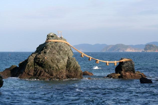 «Женатые скалы», соединенные ритуальной веревкой, символизируют собой двух богов, ставших прародителями Японии – Идзанаги и Идзанами, а веревка, вес которой, кстати, около тонны – это символ нерушимости и святости супружеских уз. Три раза в году на специальной церемонии монахи храма, находящегося напротив скал, меняют веревку, привлекая к и без того популярной достопримечательности еще больше туристов.