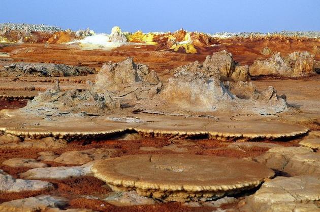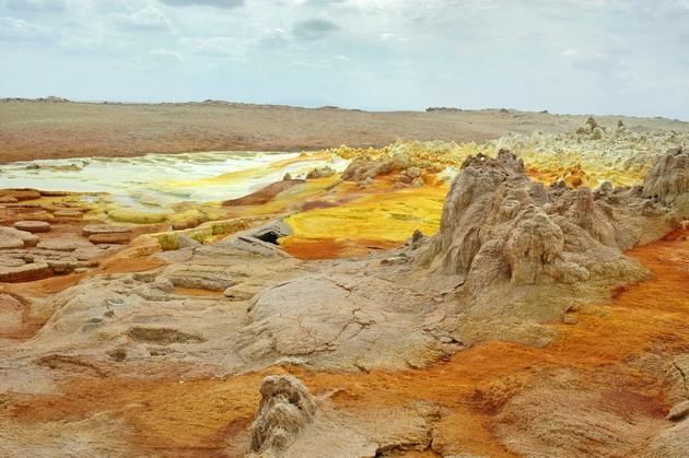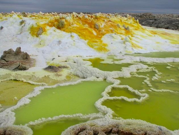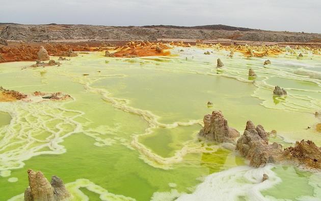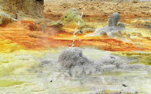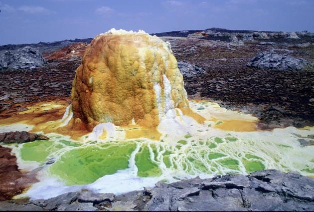 Здесь прямо из скал льется раскаленная лава, а вся земля, если можно ее так назвать, покрыта коркой соли, раскрашенной в самые причудливые цвета благодаря воздействию серы. Куда ни кинь взгляд – везде удивительные природные образования в виде соляных столбиков, инопланетных зонтиков и прочих фигурок, появляющихся здесь благодаря горячим источникам и гейзерам, а на юго-западе вулкана и вовсе находится целый соляной каньон, образовавшийся здесь из-за эрозии. При этом сам вулкан среди всех этих фантастических пейзажей различить довольно трудно. Вулкан Даллол – самый низкий вулкан в мире. Он находится на высоте 45 метров ниже уровня моря.