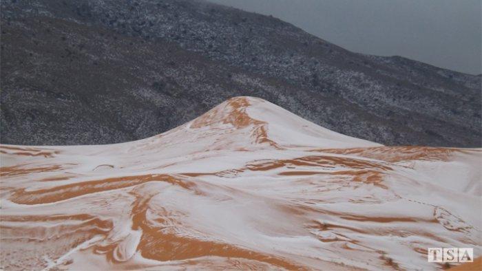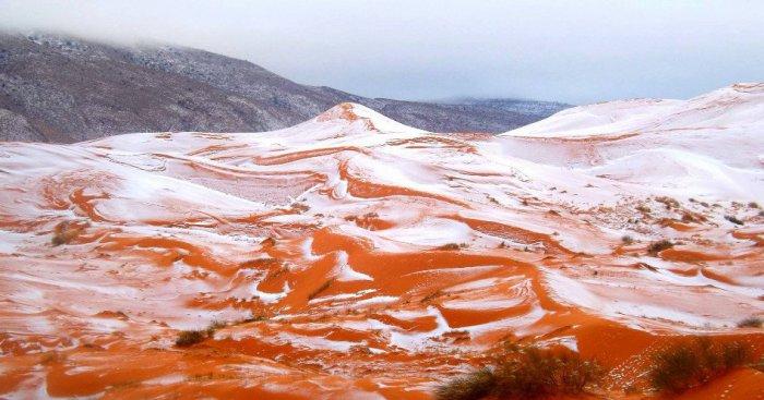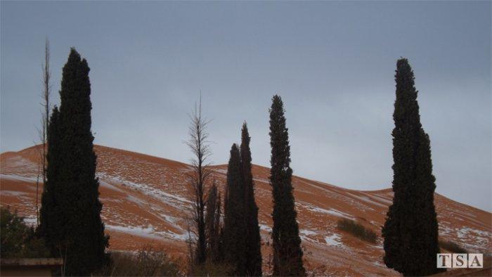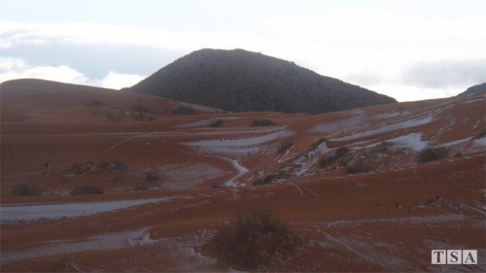 Четыре года назад здесь шел снег около получаса, но практически сразу таял. Настолько обильного снега не было в Сахаре уже порядка сорока лет. Фотограф-аматор по имени Карим Бучетат сумел зафиксировать при помощи камеры это удивительное событие для одного из самых засушливых мест на планете.