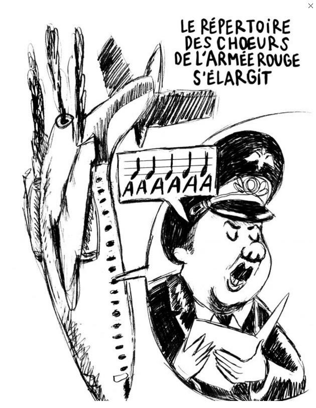 На картинке можно увидеть пикирующий самолёт с военнослужащими внутри, из которого доносится «а-а-а-а». Подпись к изображению гласит: «Репертуар военного хора расширяется».