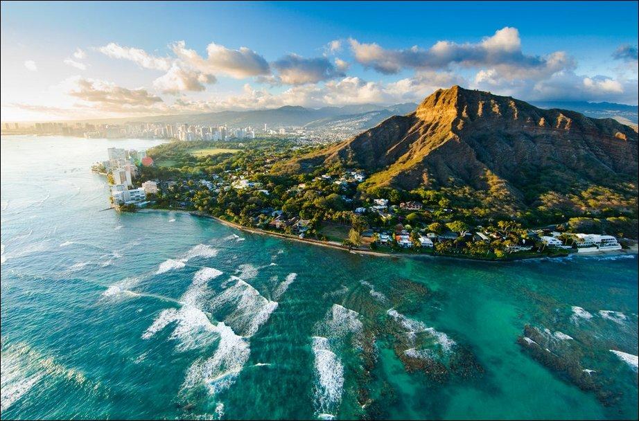 Фантастическая природа, живописные пляжи, тропические растения, прекрасная погода круглый год - это всё про Гавайи. В целом, Гавайи являются 50-м штатом страны. Более 100 островов различных размеров и форм входят в этот архипелаг, но только 7 из них являются обитаемыми. По последним данным население Большого острова составляет чуть больше 180 тыс. человек. Общая протяженность архипелага - 2400 км.