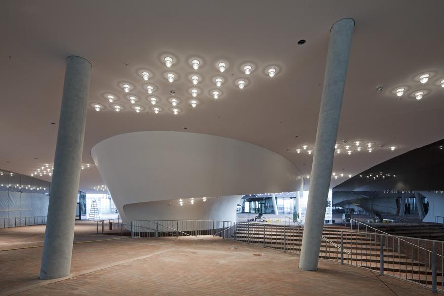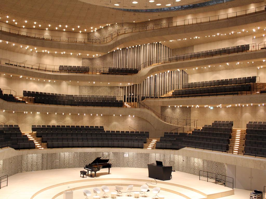 Новое здание имеет прекрасный волнообразный фасад, изогнутые лифты и огромные лестницы. Проект швейцарской архитектурной фирмы Herzog and De Meuron обладает структурой кораллового рифа, через потолок и стены которого проходят 10 000 акустических панелей.