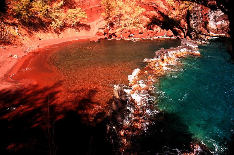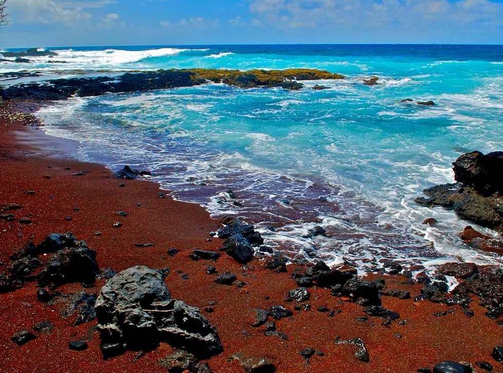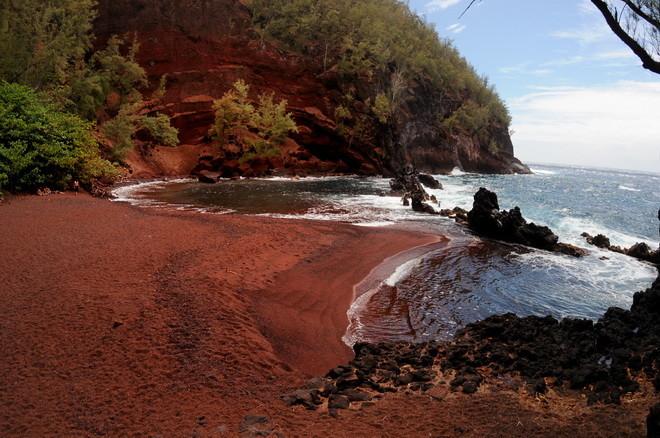 Встретить здесь пляж черного песка не представляет особой сложности – острова вулканического происхождения, какими являются Гавайи, вполне способны подарить миру сразу несколько «угольного» цвета пляжей. А вот пляж из красного песка (Red Sand Beach) на острове Мауи, названный пляж Каихалулу (на гавайском – Kaihalulu Beach) – достаточно редкое творение природы, в мире существует не так много пляжей красного цвета.