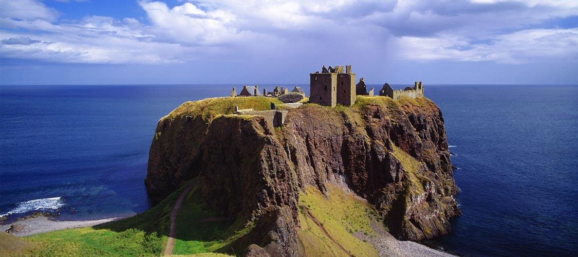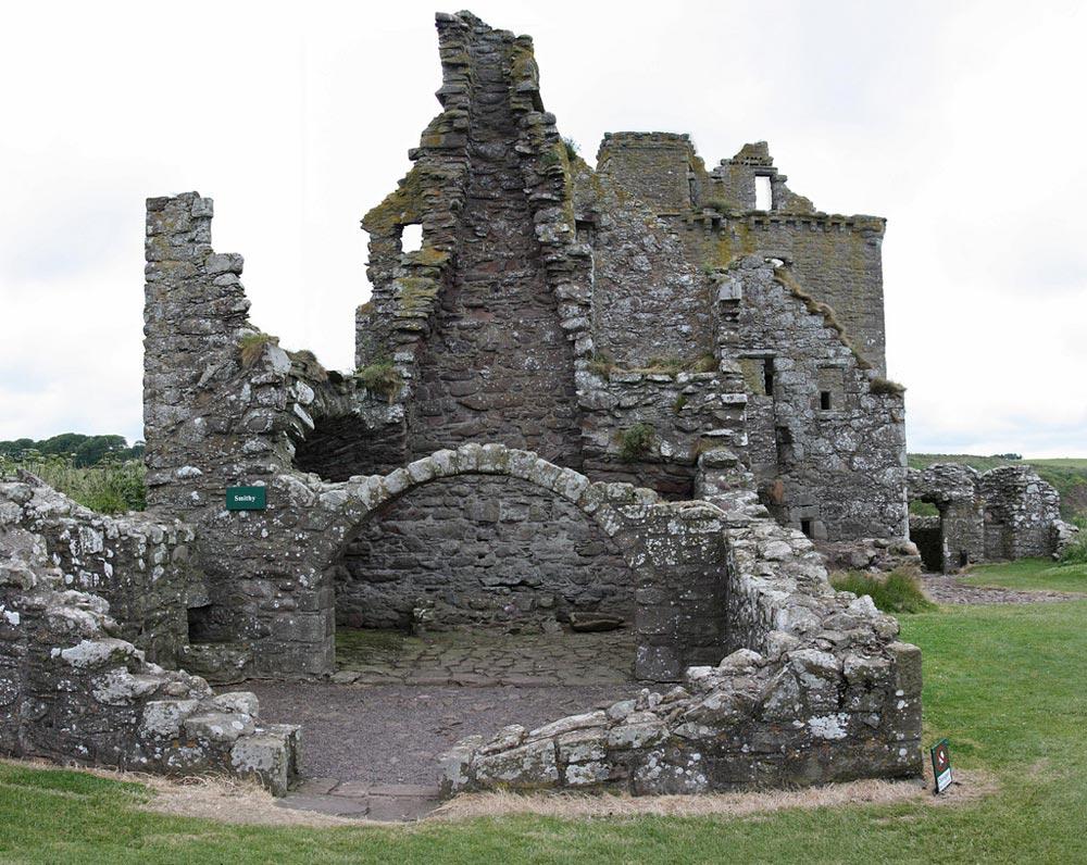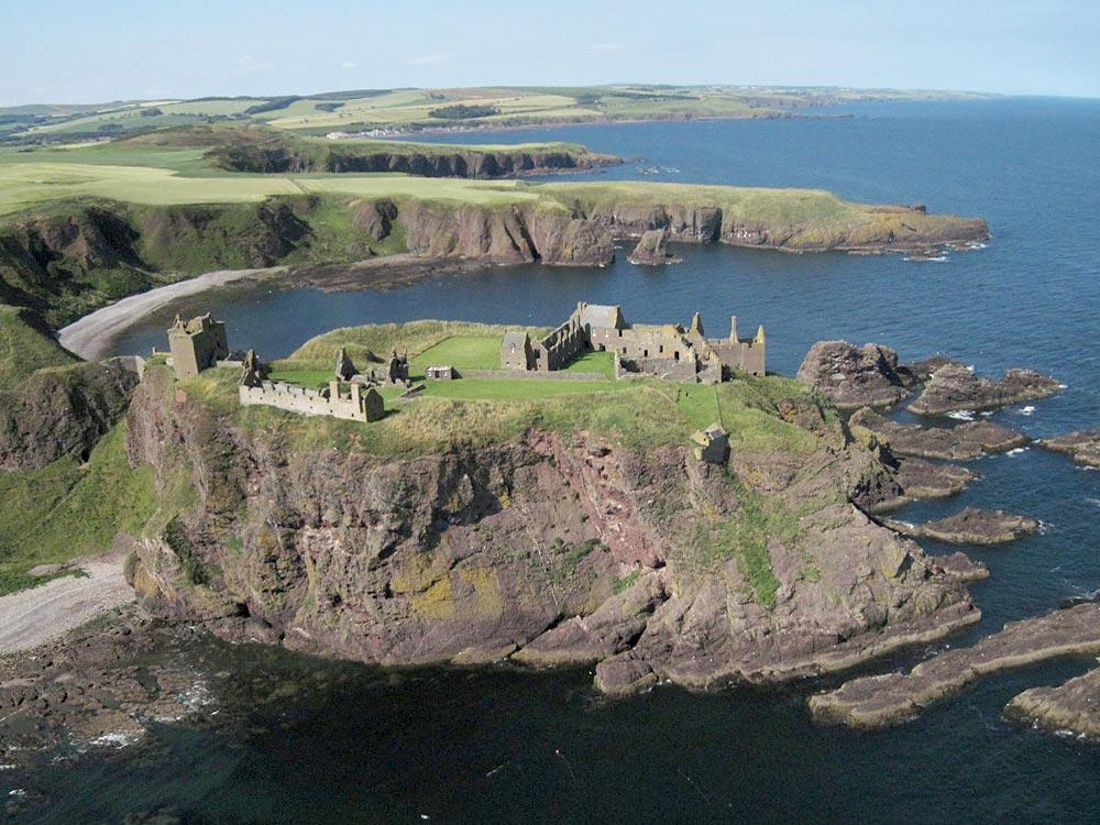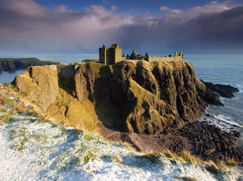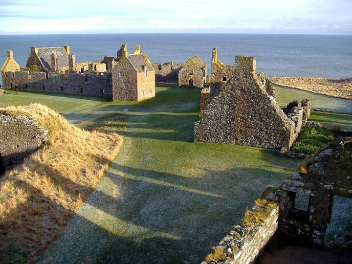 Замок Данноттар расположен на скалистом плато, возвышающемся над морской гладью. Попасть в средневековую крепость можно было через главный вход, хорошо укрытый от посторонних глаз, либо воспользовавшись тайным лазом – к заветной двери вела узкая тропа через пещеры. В конце 5 столетия христианский миссионер Ниниан, позже причисленный к лику святых, заложил здесь часовню. Его целью было обратить в веру пиктов – древний народ, в то время населяющий территорию центральной и северной Шотландии.