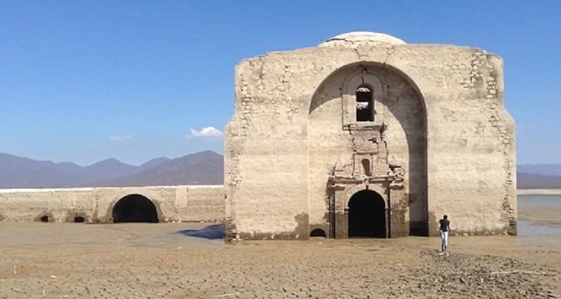 За последние месяцы уровень воды сильно упал, полностью обнажив церковь. Несмотря на долгое пребывание под водой, 400-летняя постройка прекрасно сохранилась. Засуха полностью открыла церковь монахов-доминиканцев в Мексике.