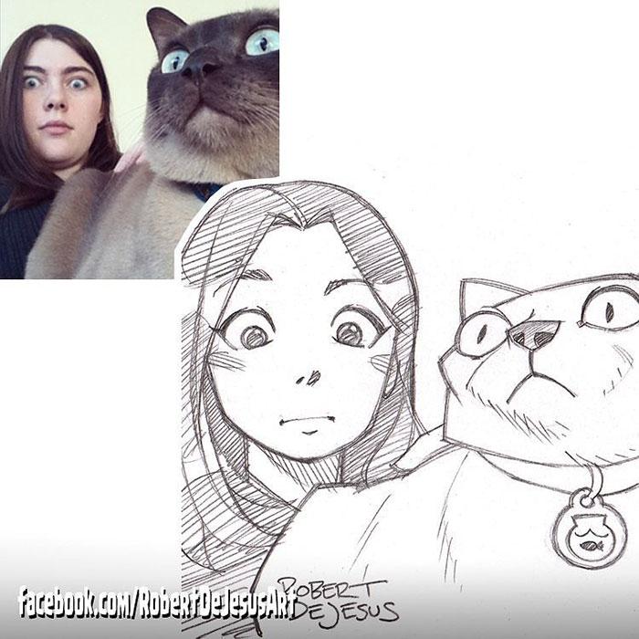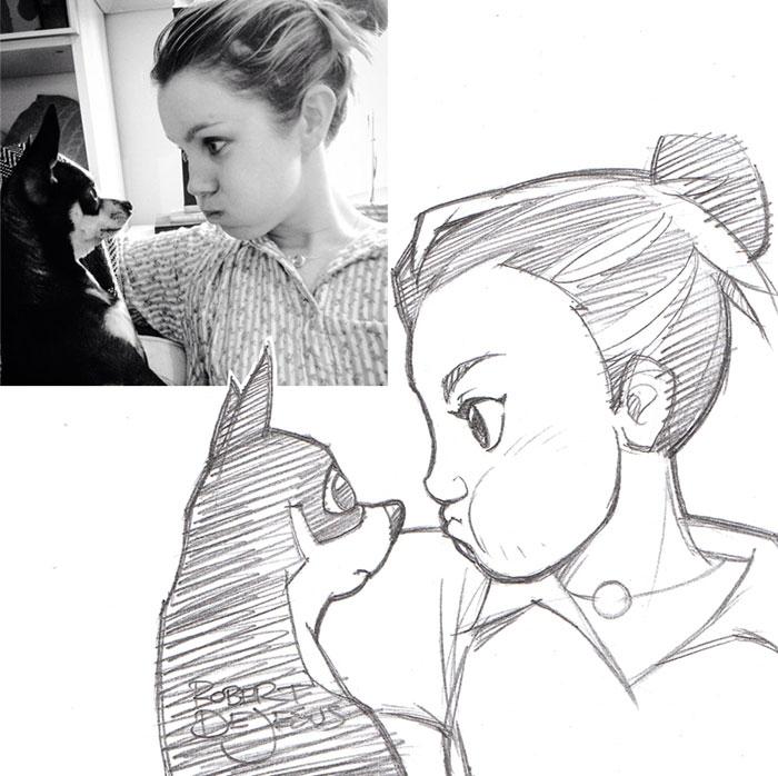 А мы предлагаем вам взглянуть на милые работы Роберта, на которых он изобразил незнакомцев с их питомцами.