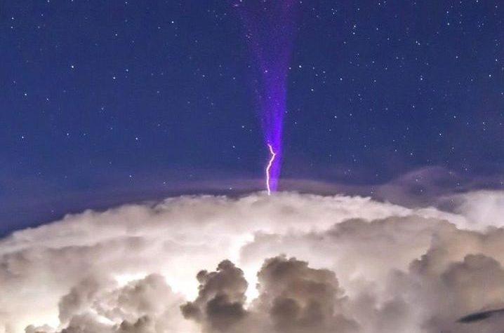 Молния, которая запечатлена на снимке, бьет вверх из облаков. Такие явления возникают гораздо выше обычных молний. Вспышки происходят в верхних слоях атмосферы, благодаря чему они имеют фиолетовый, а иногда и красный цвет.