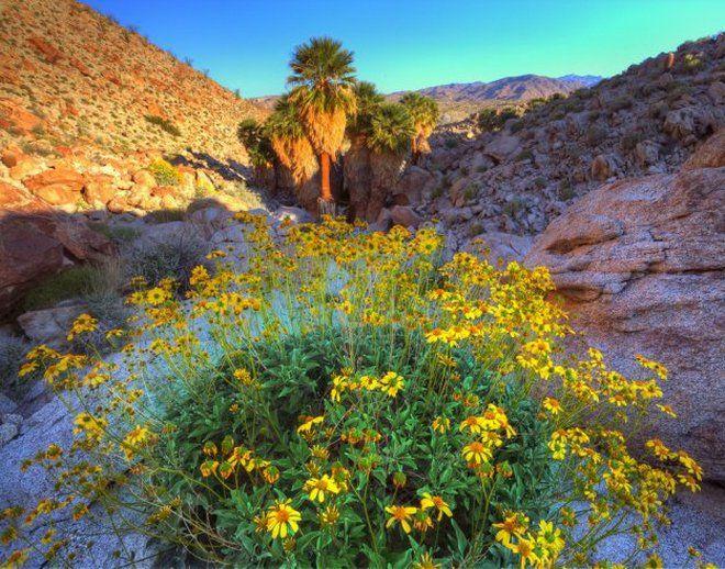 В Национальном парке Анза Боррего, площадь которого более 2,4 тысячи кв. км, большую часть территории занимает безжизненная пустынная местность. Однако, эта пустыня не совсем обычна. После зимнего сезона дождей сухая земля оживает, покрывается яркими цветами и сочной травой. Туристы из Америки и других стран приезжают специально, чтобы увидеть это фантастическое зрелище. Если дождей в пустыне выпало мало, цветение будет более скудным.