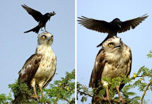 Воро́ны (и другие представители семейства врановых: во́роны, галки, сороки, галки и т.д.) любят тянуть за хвост других птиц и животных, которые в два раза больше, потому что они их даже не боятся!