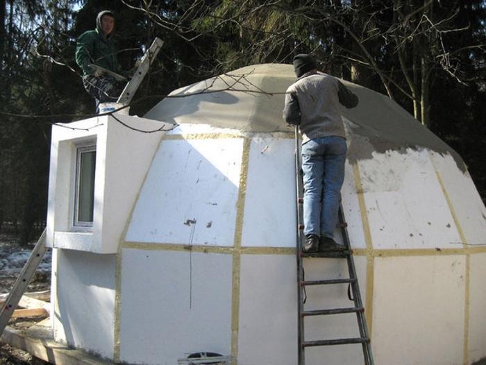 Подобные жилища имеют ряд преимуществ, главное из которых – скорость их возведения. На строительство одного такого купольного дома уходит всего 2 часа! Блоки из пенопласта обрабатывают огнеупорным раствором, а затем делают из них каркас дома. После этого необходимо вырезать проемы для окон и дверей. В завершение полученную конструкцию покрывают слоем шпаклевки. Форма купола тоже выбрана не просто так. Исследователи и ученые утверждают, что дома в виде полусферы отлично выдерживают подземные толчки.