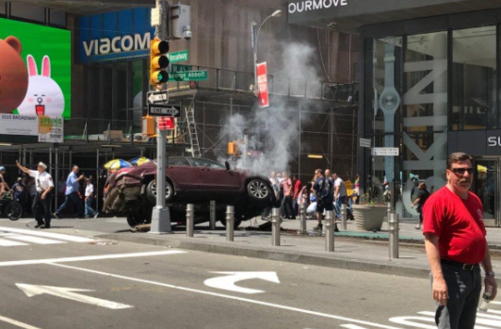 Дымящееся транспортное средство, темно-бордовая «Хонда», застряла у столба на тротуаре. Движение по Таймс-Сквер перекрыто сотрудниками правоохранительных органов.