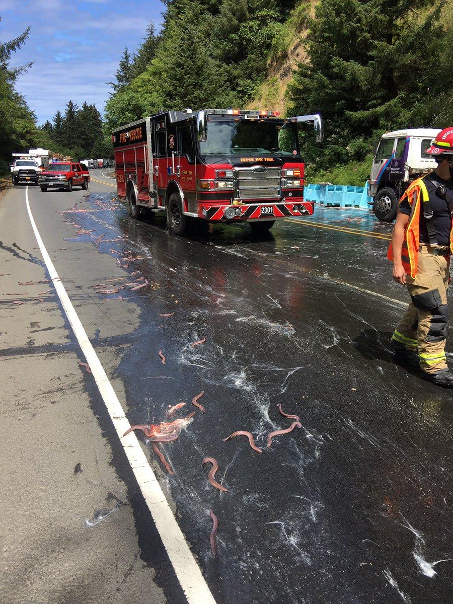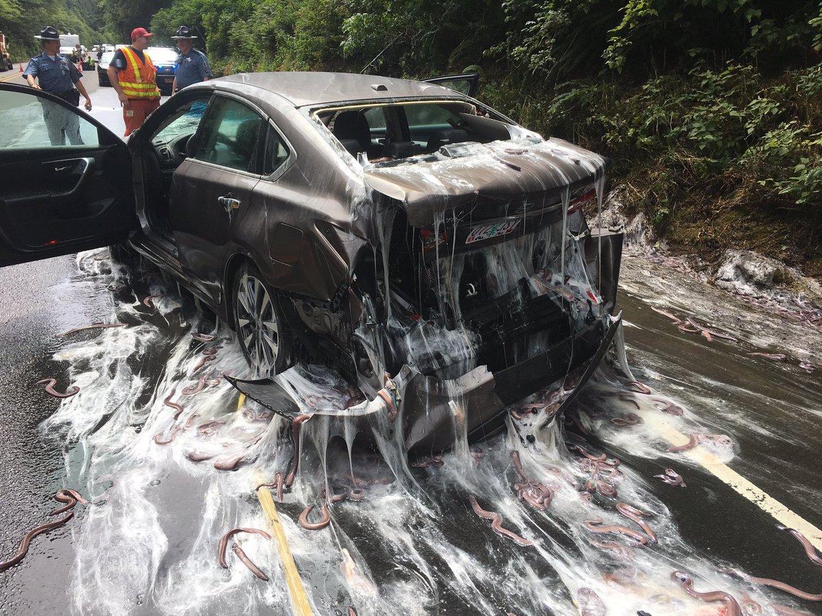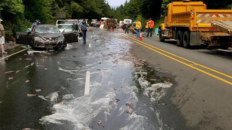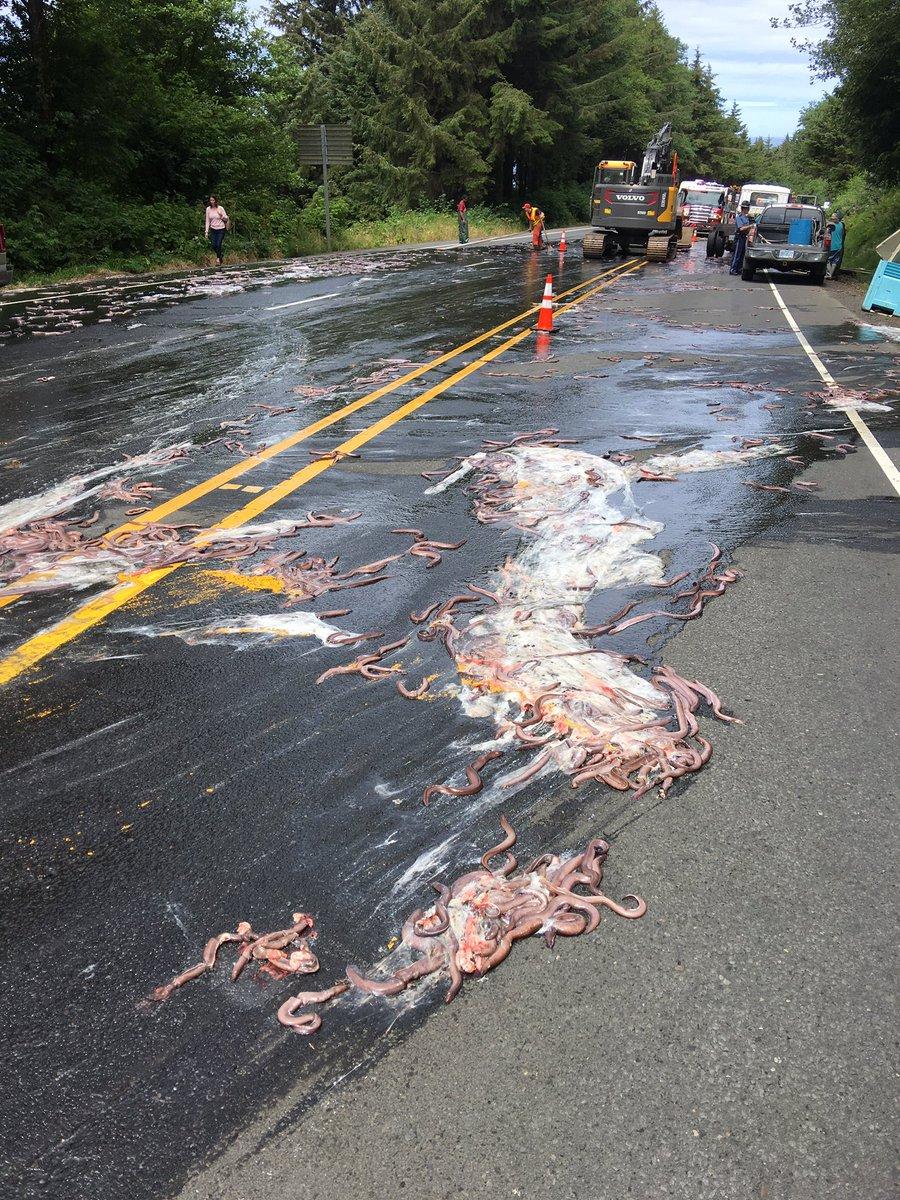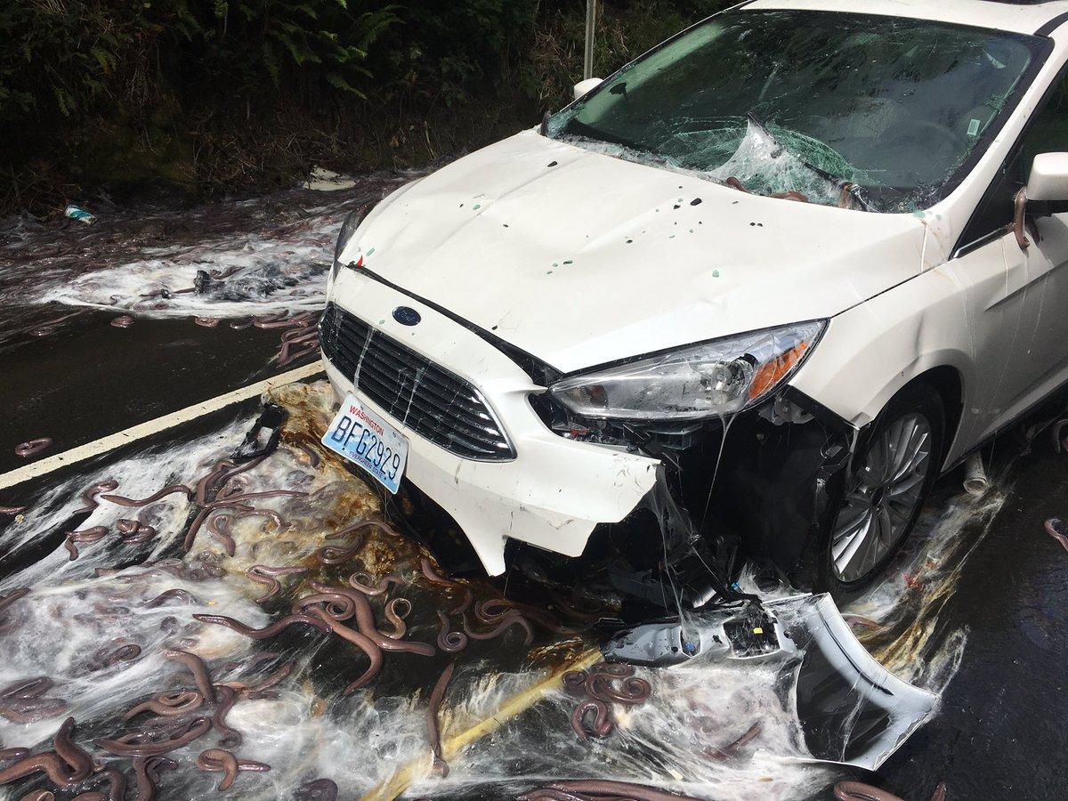 Перевернувшийся грузовик с угрями и слизью изгадил трассу и два автомобиля. В результате аварии никто не пострадал. При этом перевозившиеся в 13 специальных контейнерах с морской водой миксины погибли. Чтобы очистить трассу от слизи и сотен угрей, дорожные службы сузили проезжую часть до одной полосы.