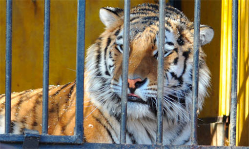 Волонтеры оборачивают джинсовую ткань вокруг шин и бросают их в клетки ко львам, тиграм и медведям.