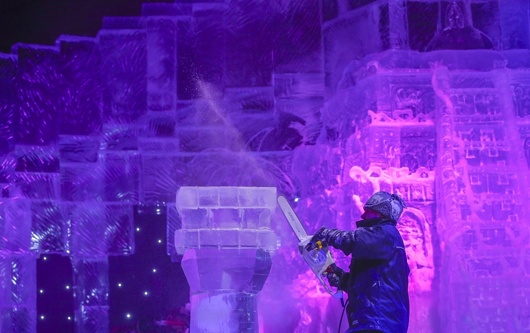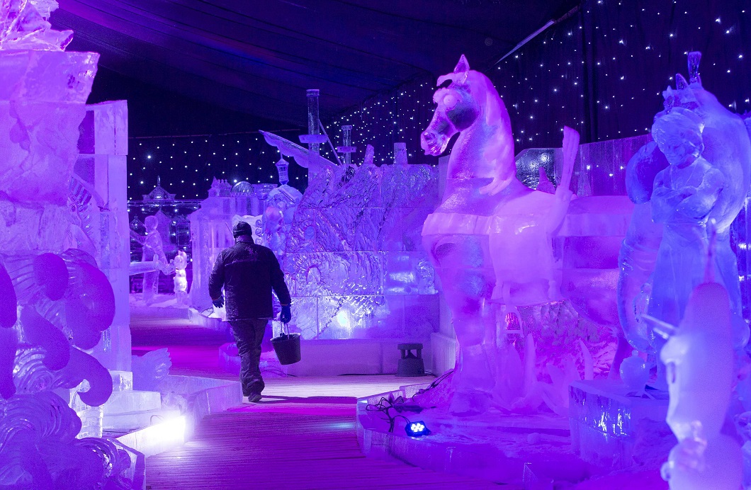 1. Скульптор несет ведро мимо ледяных скульптур во время ежегодного фестиваля ледяных скульптур в бельгийском Антверпене. (© Yves Herman / Reuters)