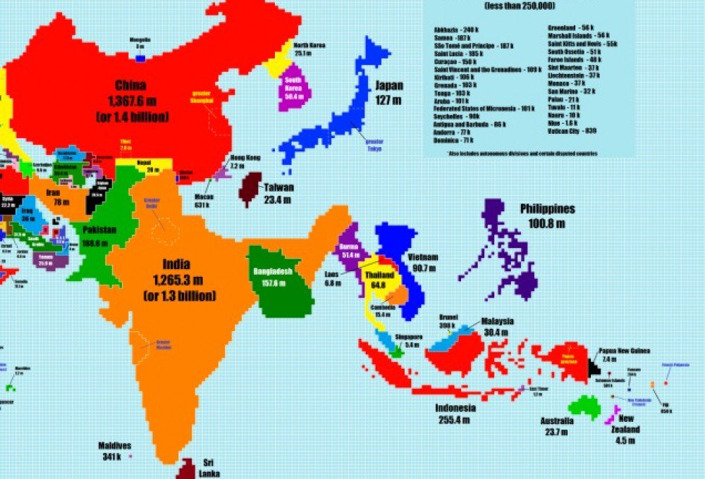 Данная карта мира позволяет по-другому взглянуть на расстановку сил на мировой геополитической арене. Впрочем, возможности той или иной страны определяются не только численностью ее населения.