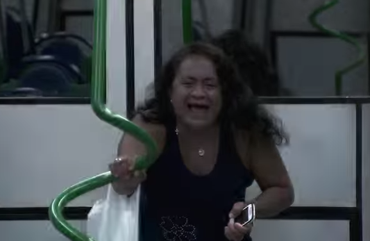 Сюда по ролику, больше всего испугалась женщина, ехавшая одна в вагоне. Когда поезд остановился на станции, но не открыл двери, она начал колотить и звать на помощь. Но когда к вагону подбежали "зомби" и стали прорываться внутрь, одному из них это все же удалось сделать, ее ужас был всепоглащающий.