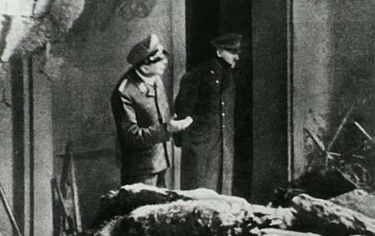 По свидетельствам, основатель Третьего рейха, понимая, что грандиозные планы рухнули, что он побежден, поднялся над поверхностью своего бункера, чтобы в заключительный раз осмотреть свой город. При этом в его сопровождении находится офицер СС.