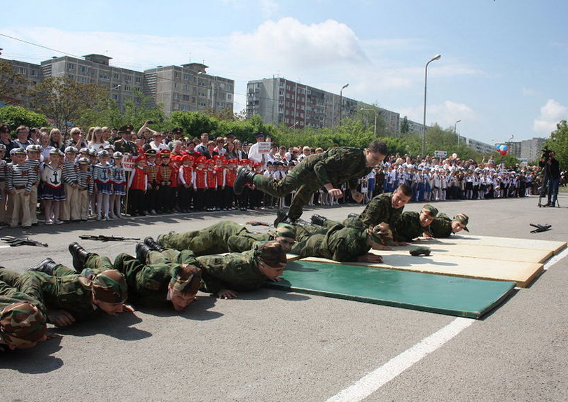 По площади прошагали «моторизованная колонна» детской «техники», «рота Почетного караула», а также «подразделения» пехоты, ВВС и ВМФ.