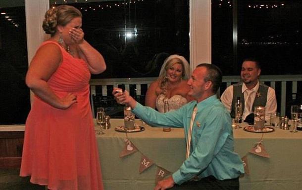Неделю назад в социальной сети Reddit появился снимок с заголовком "Свадебный кошмар любой девушки", на котором гость делает предложение своей подружке прямо у стола новобрачных. Пользователей сети заинтересовал не сам факт происходящего, а напряженная улыбка невесты, которая, по мнению многих из них, выражала одновременно и радость, и разочарование.