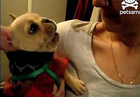 Сама хозяйка говорит своему стильному малышу, старательно одетому в футболочку и свитерок, что она его любит и прижимает его к груди, а невероятно ласковый щенок повторяет ей те же слова "Я тебя люблю" с неподдельным очарованием и любовью.