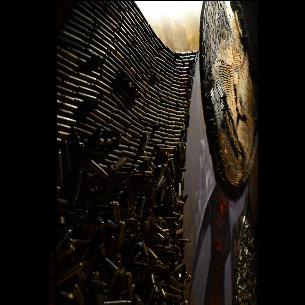 Художница рассказала, что такое изображение российского президента – это антивоенная картина. Ее размер 240х170 см. Согласно с мнением самой художницы, эта картина будет иметь историческое значение. Она создана из гильз, взятых из разных частей фронта.