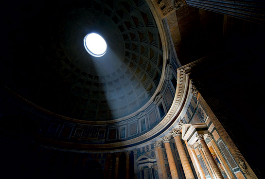 Один из старейших (почти 2000 лет) и самый большой (43,3 м в высоту и в диаметре) бетонный купол в мире, опирающийся только на стены. В него можно вписать правильную сферу, которая коснется пола храма точно в центре: диаметр ротонды равен диаметру купола и высоте сооружения. Пантеон символизирует космос, место солнца в котором занимает круглое девятиметровое отверстие (окулус) в центре купола. Это единственный источник света: в солнечный день лучи становятся почти осязаемыми. Когда идет дождь, через окулус проникают струи воды, в полу предусмотрены стоки. В Средневековье ходили легенды, что отверстие в потолке пробила нечисть, заметавшаяся при звуках первой мессы. Храм в 609 году освящен как христианская церковь, до этого он был языческим.