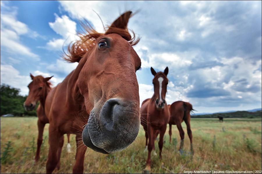 Более того, хотя лошадиная морда устроена не так, как лицо людей (глаза лошади, например, расположены по разным сторонам черепа), многие «выражения лица» у лошадей очень напоминают человеческие.