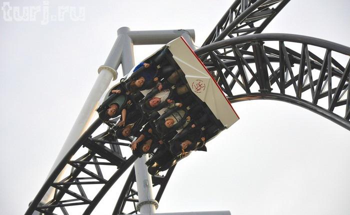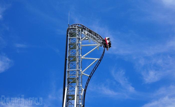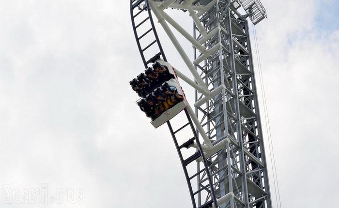 Но и это еще не все! Дав небольшую передышку, вагончик начинает движение практически перпендикулярно вверх! Достигнув высоты 43 метра, он на мгновение замирает – и устремляется вниз под углом 121 градус! Спуск от вершины этого «колена» длится всего 2 секунды. Дух не просто захватывает – кажется, от страха и сердце перестает биться!