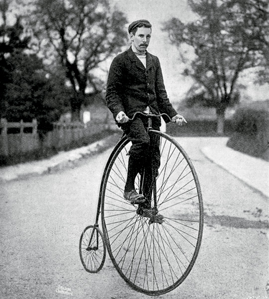 В 1869 году француз Мейе сделал велосипед, у которого, как и у модели Мишо, скорость давало большое переднее колесо с педалями и сиденьем. Англичане назвали его «пенни-фартинг» — монета пенни значительно больше фартинга (1). Но и эта модель оказалась неудобной — наездники часто перелетали через руль. Седло переместили ниже. Механизм стал менее опасным, но, чтобы крутить педали, приходилось тратить больше сил