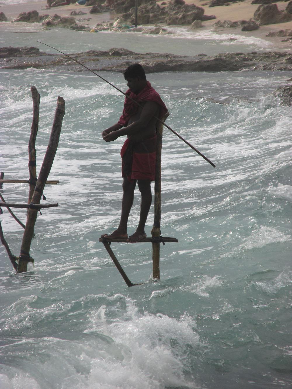 Рыбак ловит рыбу древнейшим способом, стоя на конструкциях из лавок в океане