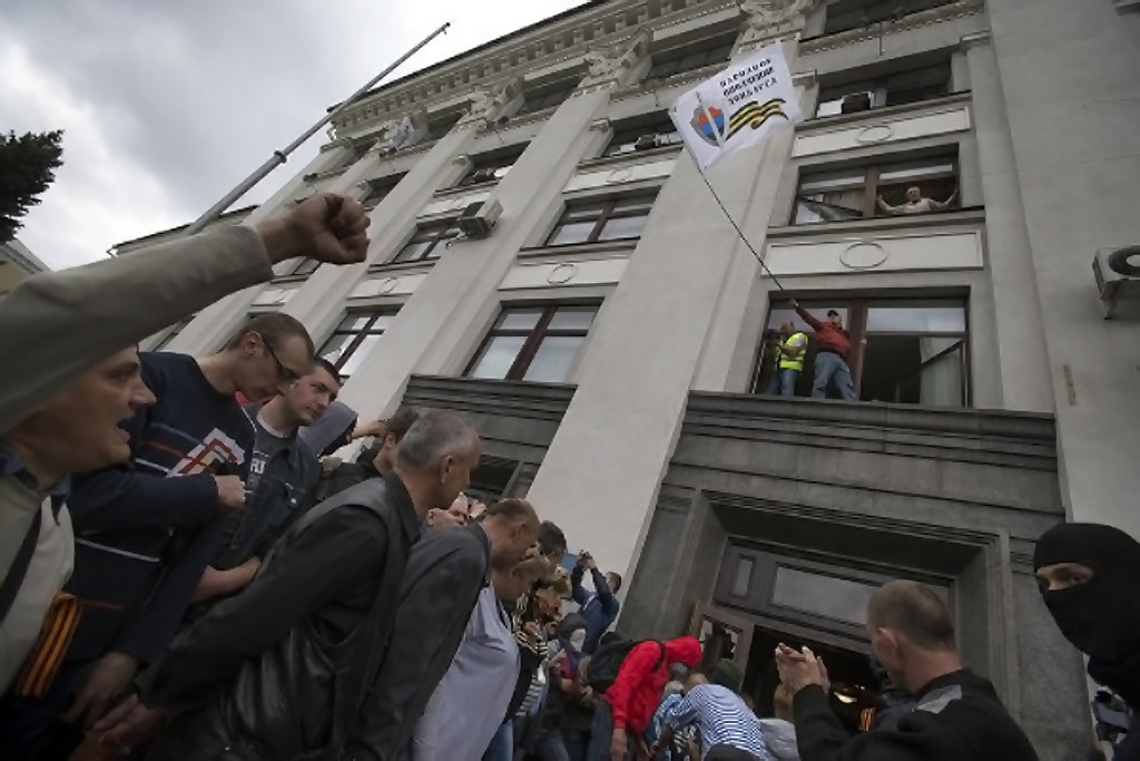 Поэтому, допустим, захват Луганской облгосадминистрации проходил под самыми разными цветами: тут тебе и флаг России (что логично), и «георгиевский» черно-оранжевый, и красный с серпом и молотом, и флаг «Народного ополчения Донбасса» с перевернутым флагом «Донецкой республики» на гербе.