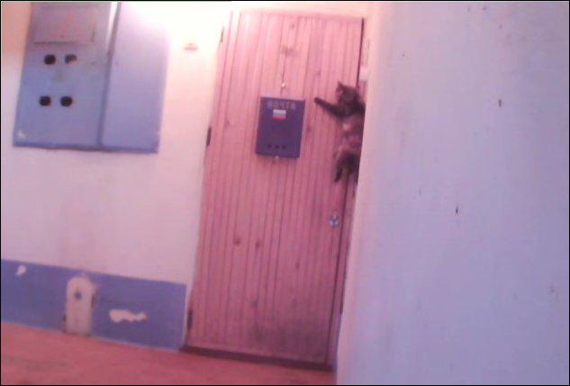 Для съемок ролика с умной кошкой по кличке Василиса хозяин установил напротив своей двери в подъезде видеорегистратор. Подойдя к двери, Василиса сначала вела себя как вполне нормальный представитель семейства своих четырехлапых сородичей – жалобно мяукала и ждала.